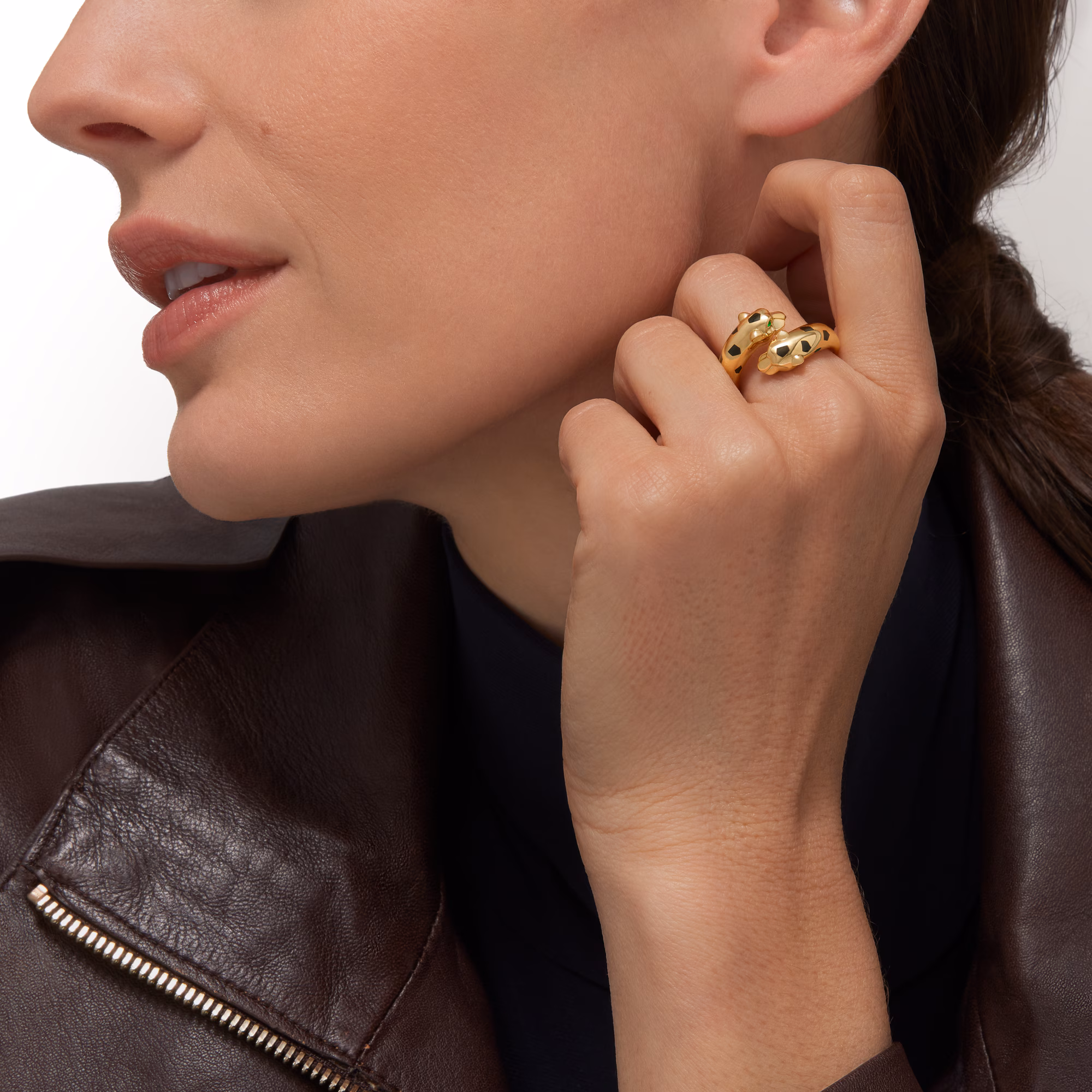 Каблучка Panthère, золото 750 проби, інкрустована оніксом та цаворитами.